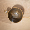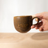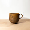 A hand-thrown, high-fired stoneware mug featuring spontaneous mottled patterns in a rustic brown glaze.